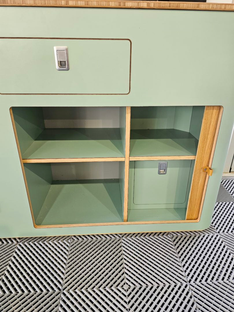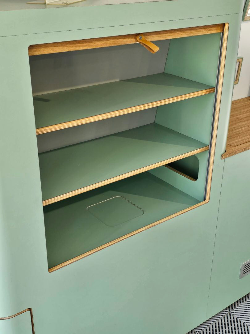 - Un meuble arrière haut composé d’un placard avec étagères fermées par un volet roulant.