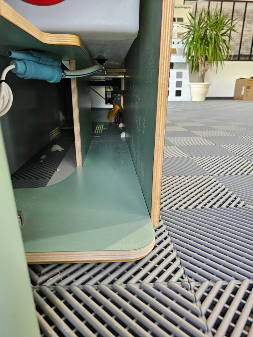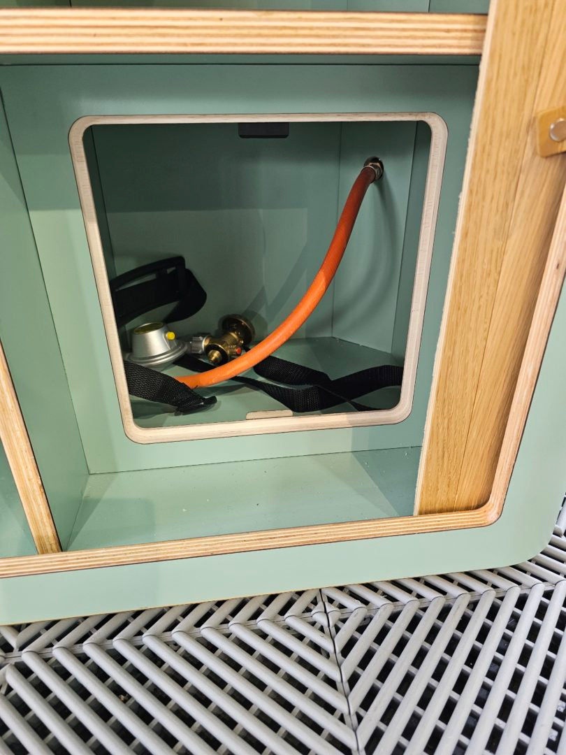- L’installation complète du système d’eau propre 43 litres dans le meuble arrière avec pompe en ligne